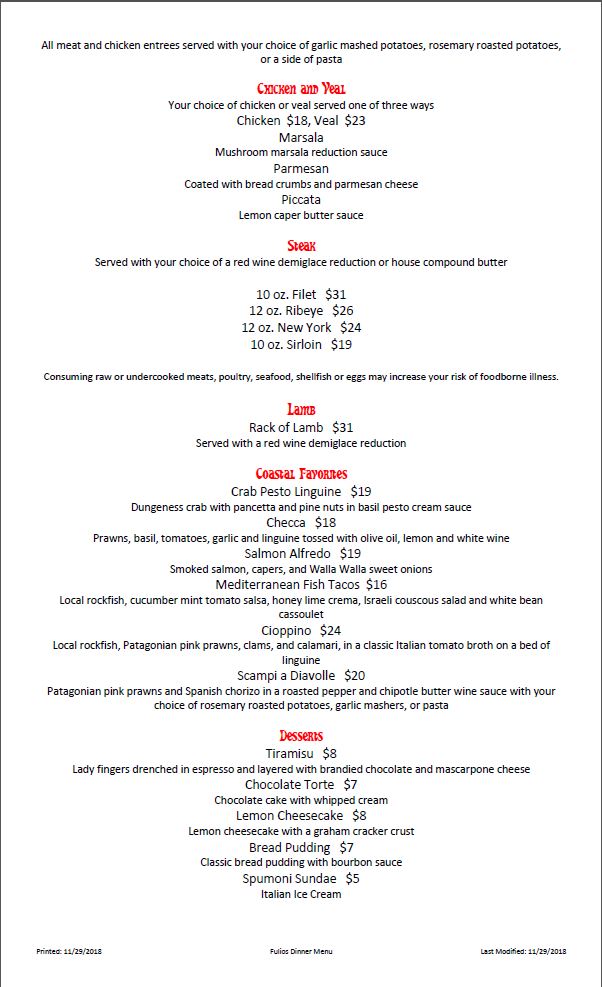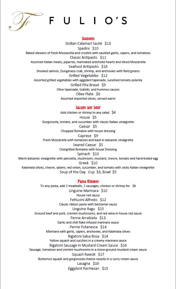 Welcome to Fulio's Restaurant, a culinary gem nestled in the heart of Astoria, Oregon. Known for its authentic Italian cuisine, this inviting eatery offers a diverse menu that tantalizes the taste buds. From delightful pasta entrees like Rigatoni Salsa Rosa with creamy marinara to the sophisticated Squash Ravioli in curry cream sauce, every dish is crafted with care. Seafood aficionados will revel in the Salmon Alfredo and the satisfying Steamer Clam Linguine, each capturing the essence of coastal flavors.